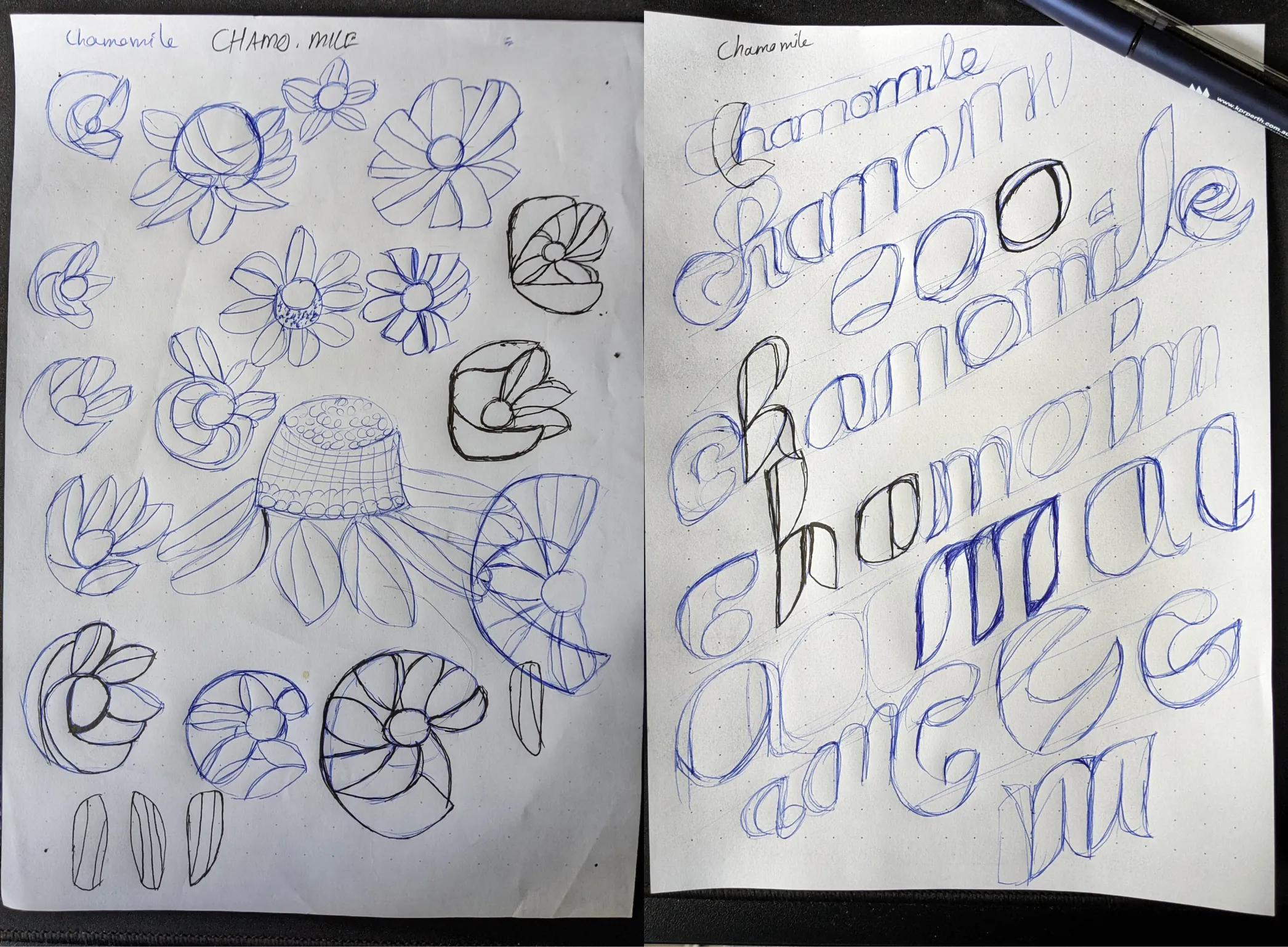 Multiple attempts were made to draw the closest possible analogues to the characteristic/s of the chamomile ~ organic, slightly oblong, and rigid. But neither angular nor overtly predictable curvatures.