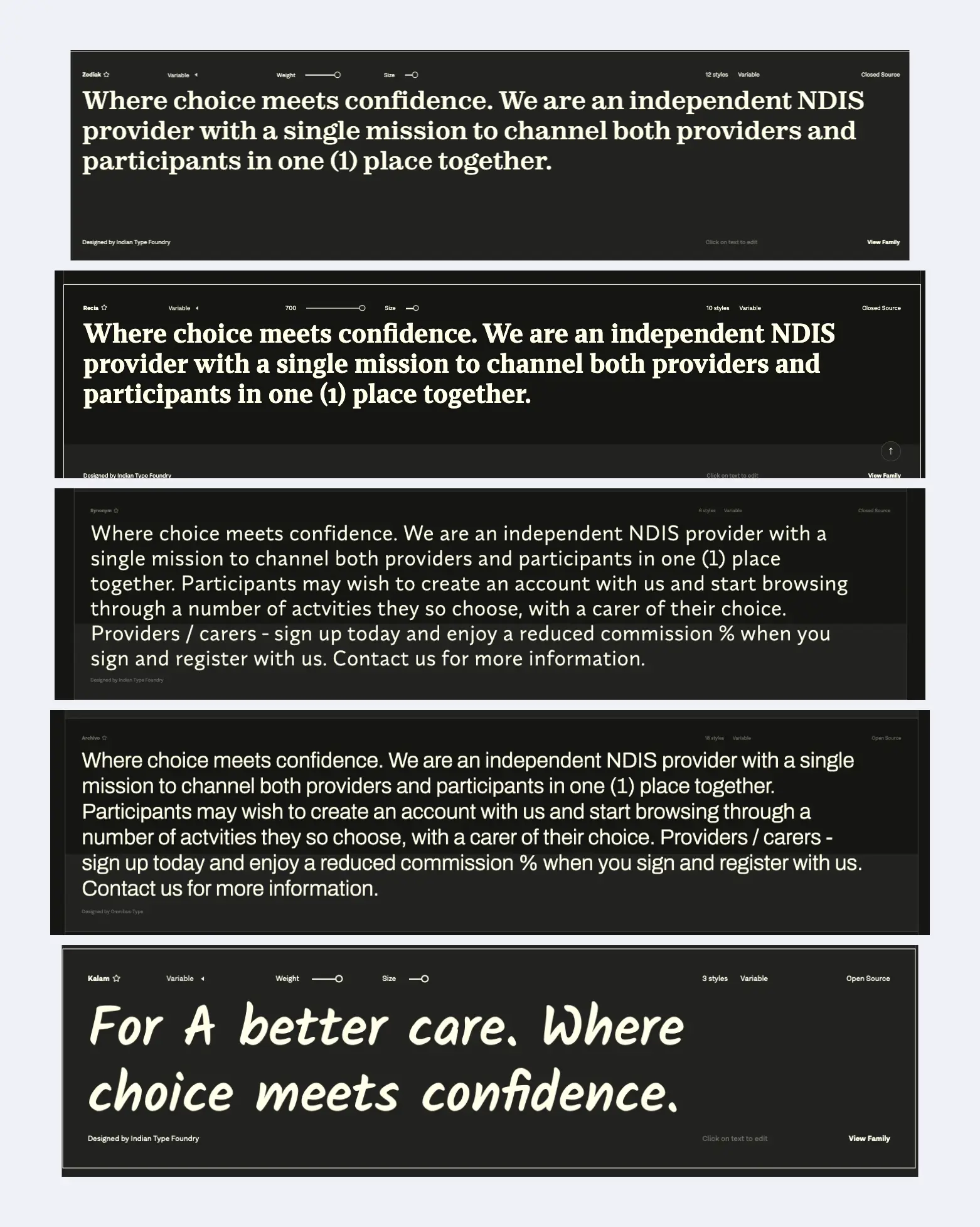 Upon the list of options (as shown here) ~ the industrially-inspired sans-serif Synonym was chosen to be paired with the handwriting analogue Kalam. The latter was encouraged to only be used judiciously. Altogether these aim to promote and (though not overly embellishing, hence the rationale for a slightly industrial Synonym) the customer and/or users expression of individual(s) autonomy, for social cohesion.