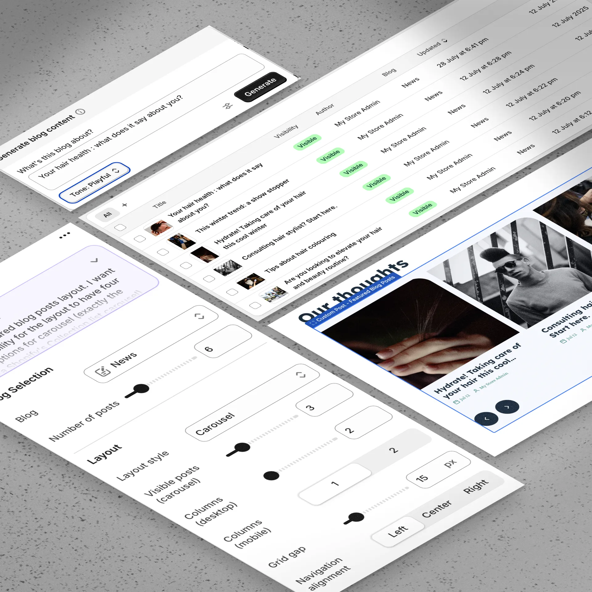 For context, many Shopify default themes offer unique / proprietary set parameters including features not congruent with others, e.g., the ability to show Posts collections on any stand-alone pages, and/or adding pictures to mega menus, to name a few; without resorting to additional plugins. Here, I prompted (within Sidekick®) a custom blog posts collection viewer at the home page with an array of options including adjustable layouts between carousels and/or grid before many other editable specifics.